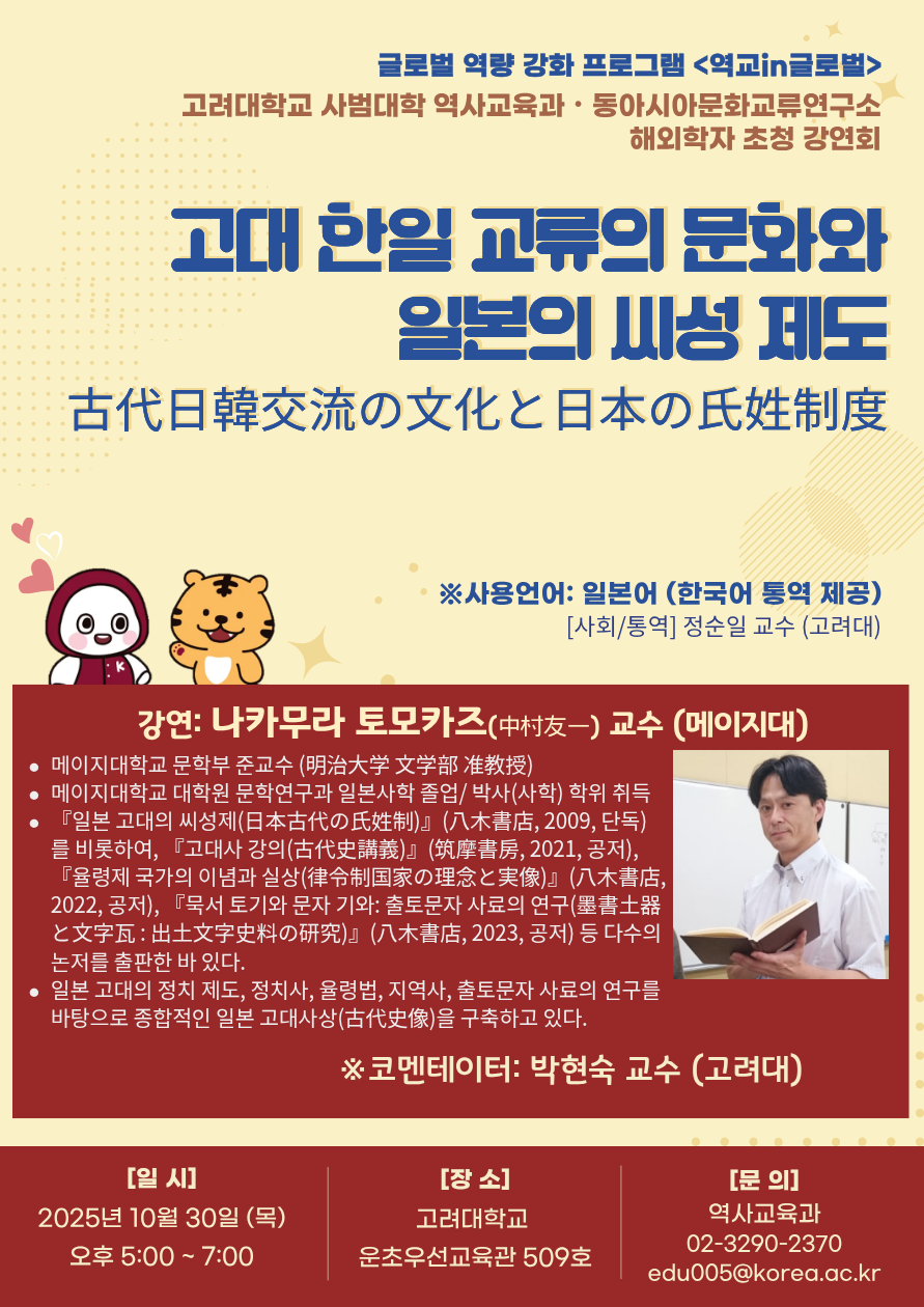 | [고려대학교 역사교육과・동아시아문화교류연구소] 해외학자 초청 강연회 |